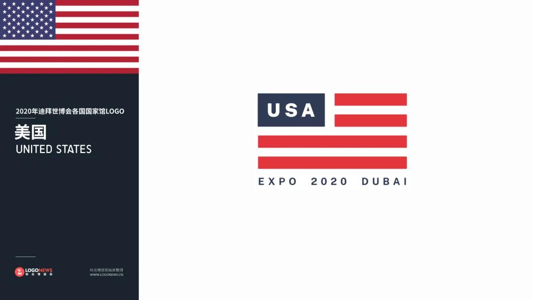 ?美國館的LOGO改自星條旗,并將其簡化為一個圖形。例如紅白相間的紅色線條只保留了四條,左上方的藍底白五角星換成了白色的「USA」字樣。