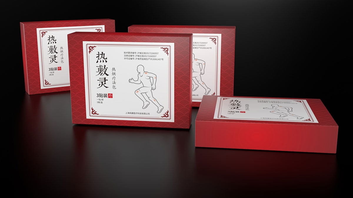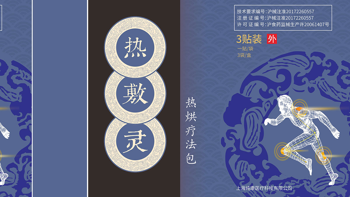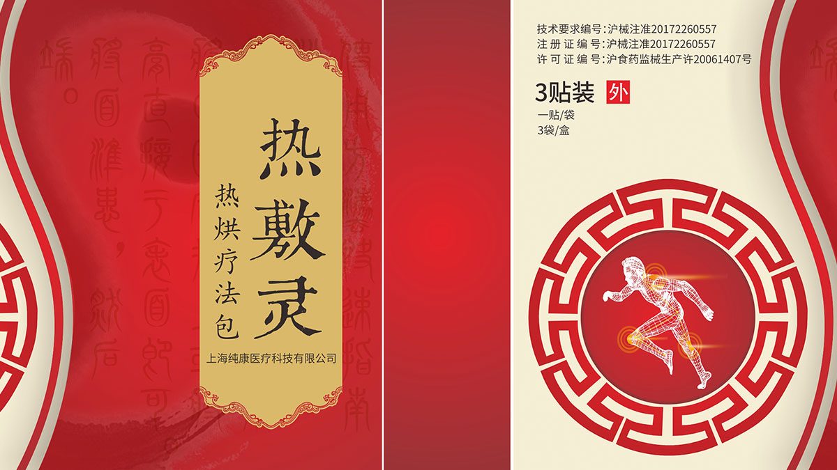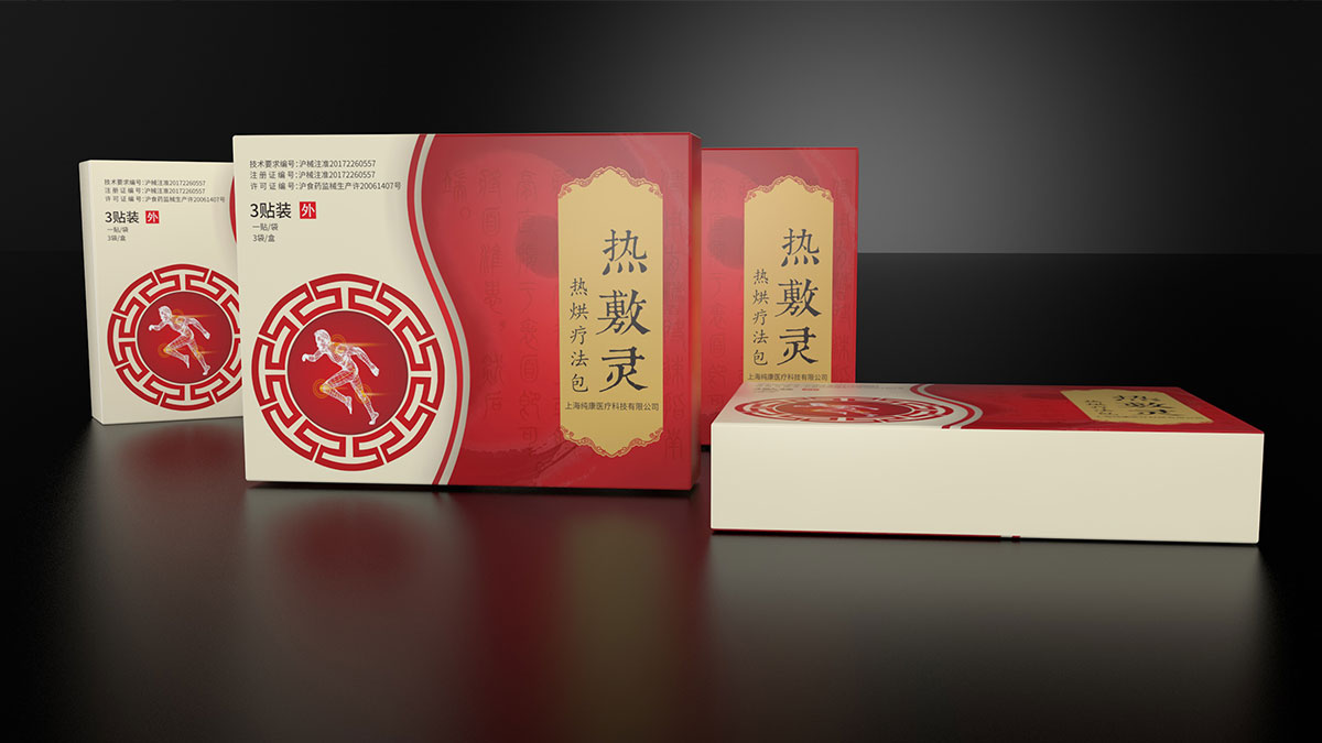 本款系列藥為貼膏,因此設計為中式風格。本款設計采用太極元素,配以篆體背景,充分的將傳統元素運用到這款包裝中。圖案選擇上也體現了該產品的功能性,讓人一眼就知道該產品的用途。