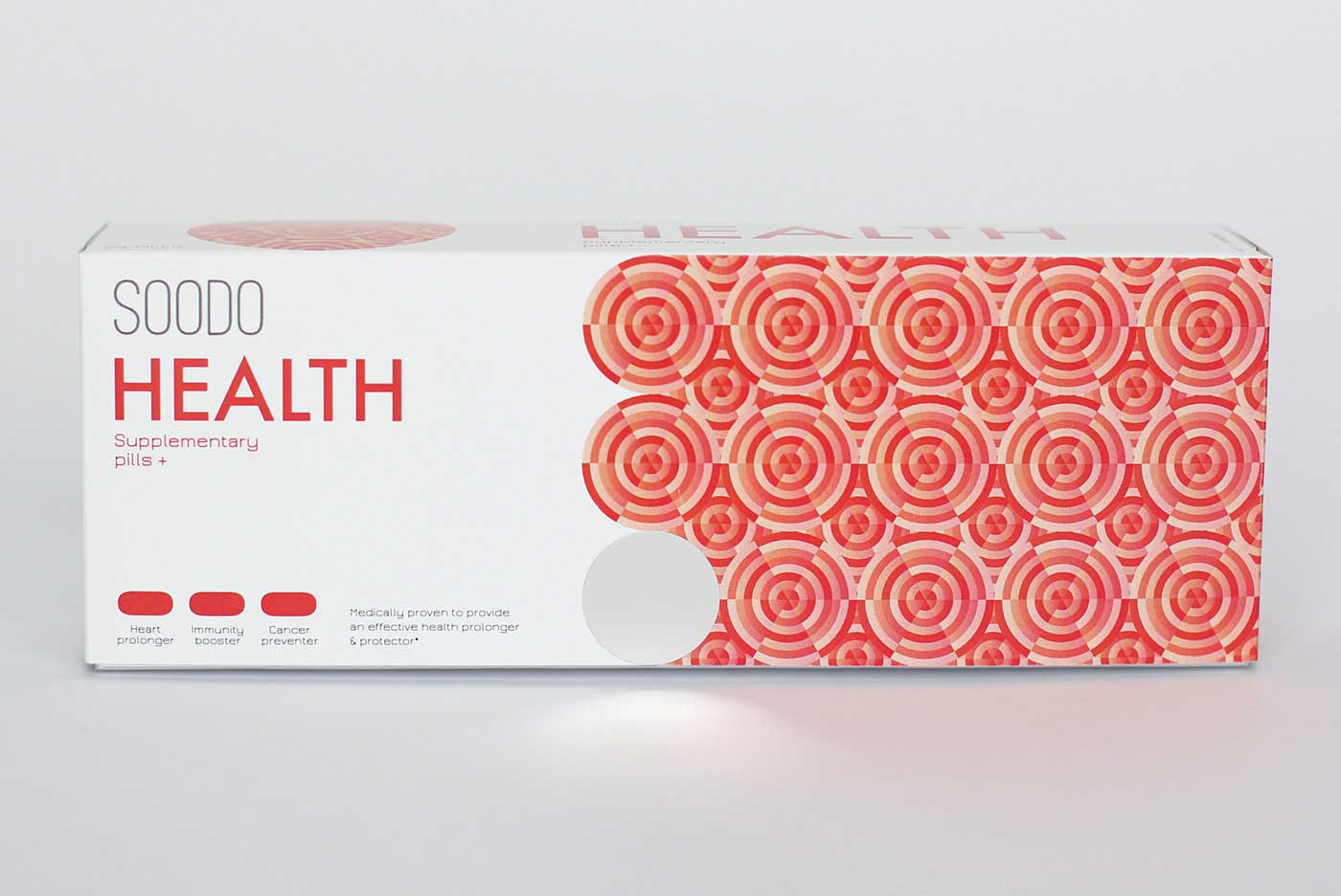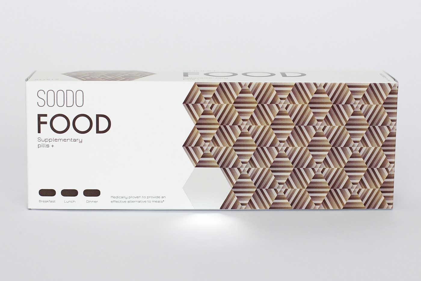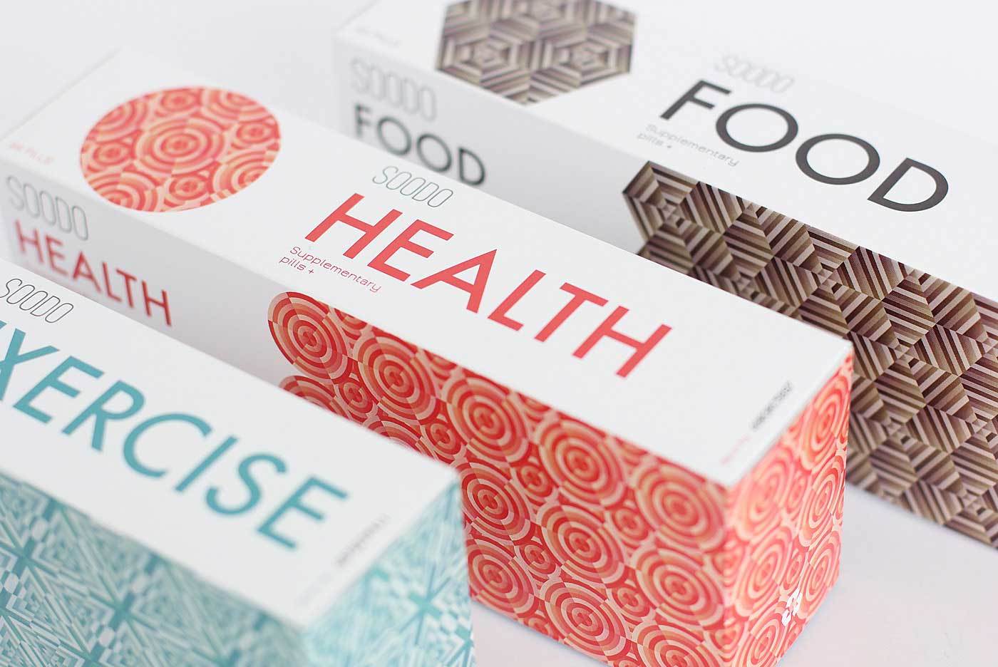 品牌名稱“SOODO”是通過將原始詞“偽”的發音,即不假的,有誤導性的。消除創造健康生活的所有自然方式的想法,導致失去與這些活動相關的重要的社會互動。我想要設計方法來反映這樣一個悲劇的后果。產品包裝采用幾何圖形進行設計,用漸變的方法使圖案更抽象化,表達補藥對人體產生的微妙變化。